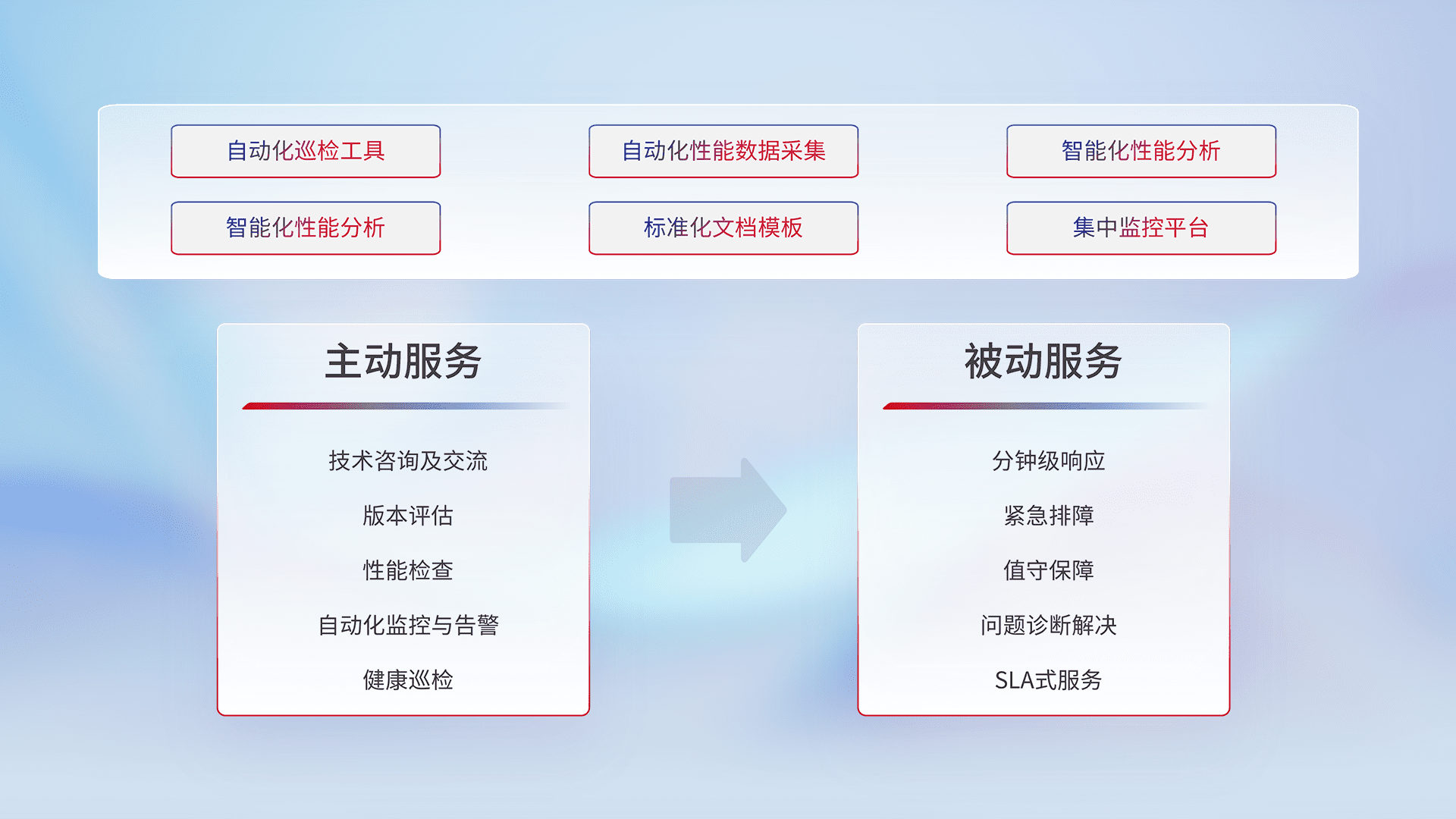 智能化工具和标准化文档,,,,保障服务质量,,提供主动服务(包含技术咨询、、、、版本评估、、性能检查、、、、自动化监控与告警、、健康巡检)和被动服务包含(分钟级响应、、紧急排障、、值守保障、、问题诊断解决、、、、SLA服务)。。。。